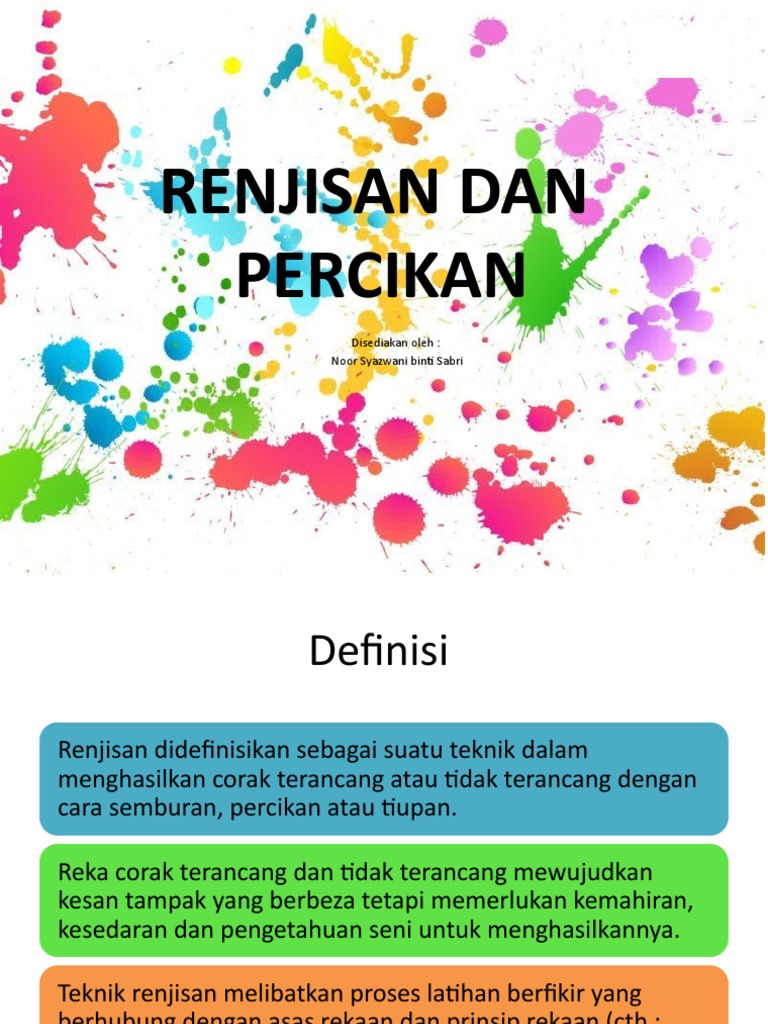 1 Apakah teknik renjisan dan percikan. I penentuan tema ii penjanaan idea iiiPelaksanan proses iv kemasan terakhir 412 Membuat kritikan karya sendiri dan rakan berpandukan bahasa seni visual teknik dan proses dengan menghubung kait seni dengan diri sendiri dan alam sekitar. Pendidikan seni visualpada hari ini kita akan memepelajari tekniik renjisan dan percikanteknik ini amat mudah.